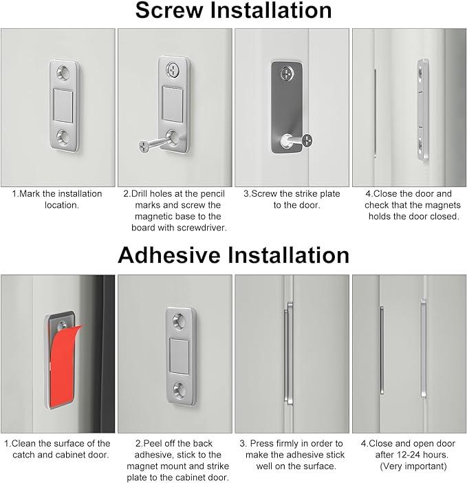 Powerful Adhesive: The double-side adhesive tape is strong enough to stay cabinet shut without drilling screw holes to screw it in. (Please note: the included adhesive comes in red and white colors and will be shipped randomly). Time saving and also protect your expensive cabinet from damage. Also provide screws for your installation. Please close and open the door after 12 HOURS in order to make the adhesive compound adhere well on this surface.