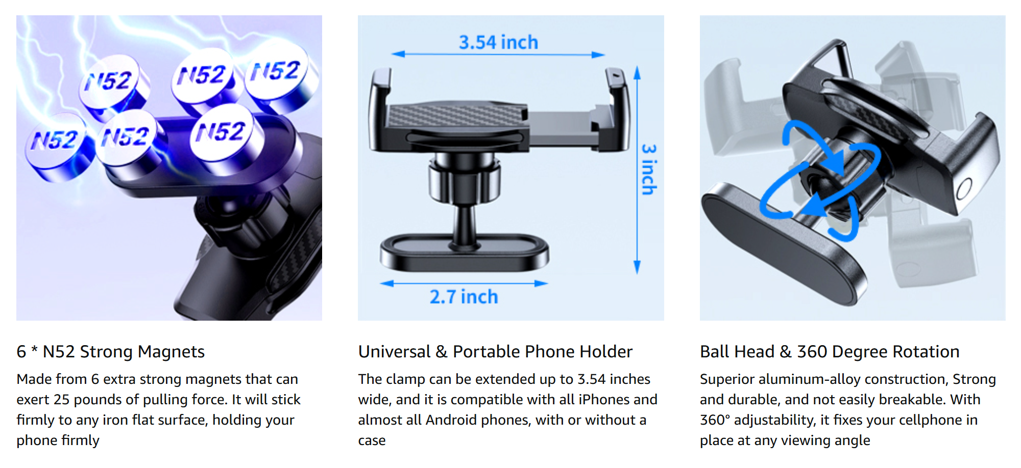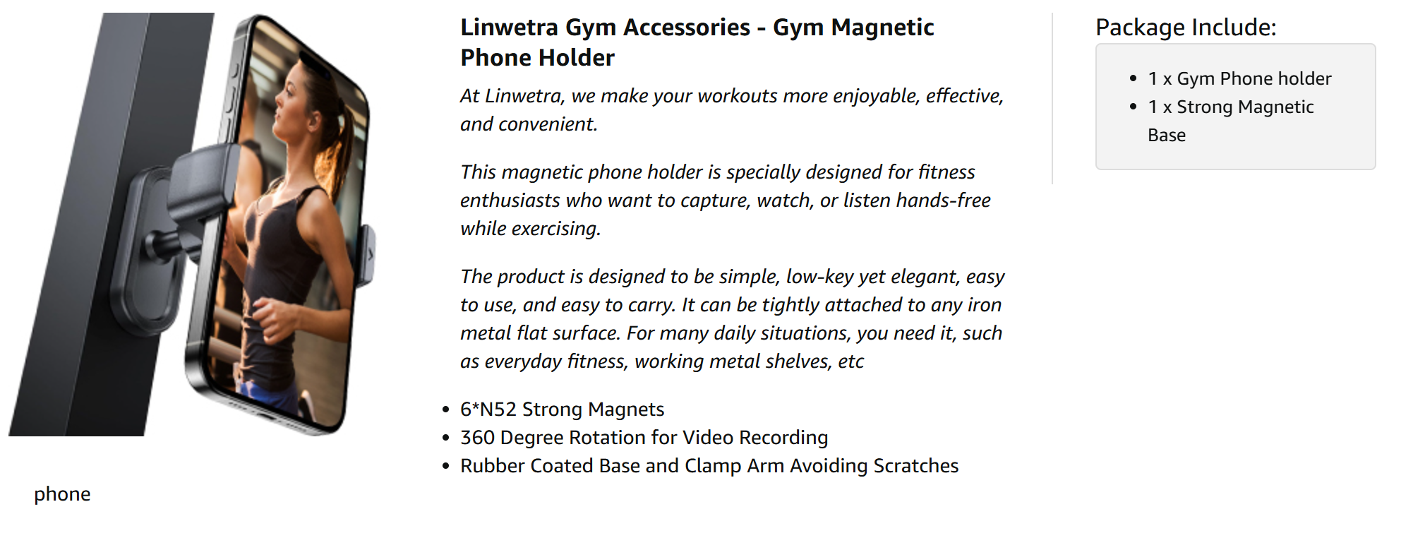 • Stability & Powerful Magnetic Base: With built-in 6*N52 industrial magnets, this magnetic phone mount can hold your phone strongly to the metal gym equipment. You can go hands-free and film or watch videos while working out, making it a reliable choice for your fitness needs