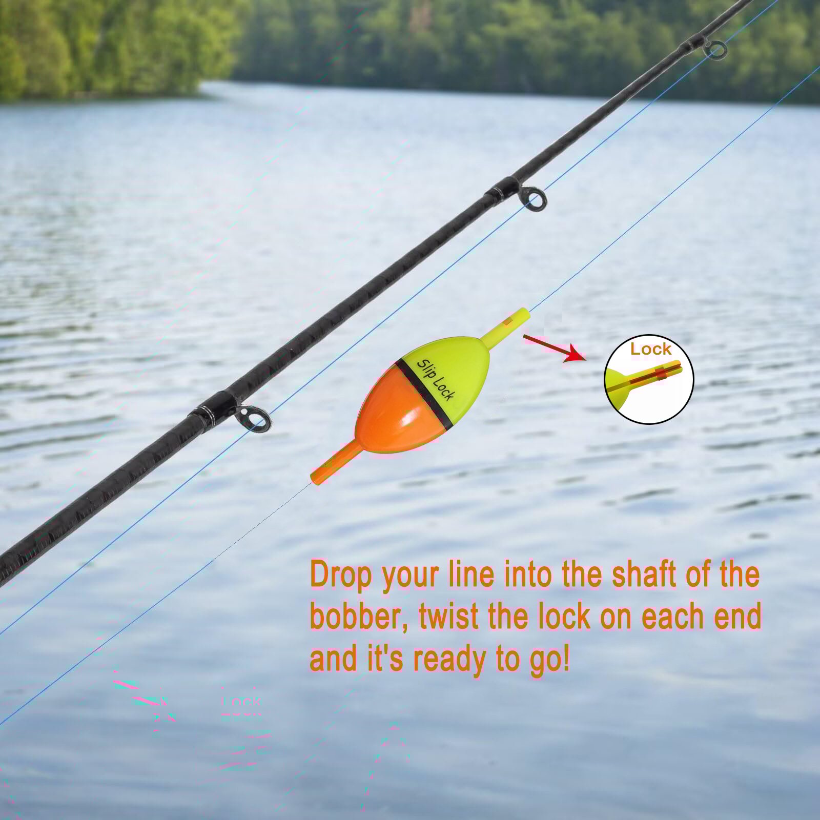 Drop your line into the shaft of the bobber, twist the lock on each end and it's ready to go! No need to cut your hook to put the bobber on or to take it off. The brightly colored hard plastic design makes it durable enough to fish all types of conditions and terrain